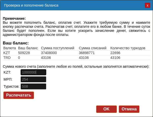 После нажатия этой кнопки будет открыто известное вам окно с настройкой суммы счета, в нем есть новая опция для тех туроператоров, у которых есть зачетные (бонусные) единицы. Также баланс стал более подробным и теперь вы можете знать общую сумму поступлений, списаний и количество выписанных туркодов за всю историю работы в системе: